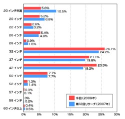 所有している薄型テレビの画面サイズでは、大型化の傾向が鮮明になった。20インチ台が2007年調査に比べほぼ横ばいか下回っているのに対し、32インチ、37インチ、42インチの現在の最多量販価格帯はすべて所有率を伸ばした。中でも42インチは前回の19.2%から23.5%と大きく伸びた。カカクコムでは、エコポイント制度の導入によりこの傾向がさらに強まる可能性があると分析している。