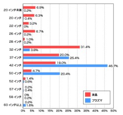 所有している画面サイズ別に液晶とプラズマの種類を聞いた質問では、32インチ以下は圧倒的に液晶テレビが多いが、37インチ以上はプラズマがいまだに圧倒的に優勢となった。