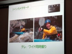 また、2D撮影でも2つの撮像素子を搭載しているという利点を生かした「ツインカメラモード」を搭載。シャッターを1回押しただけでテレ端とワイド端を同時に記録する「テレ/ワイド同時撮り」や、色調の異なる2枚の画像を撮影する「2カラー同時撮り」、感度設定を変えてシャッタースピードの異なる2枚を撮影する「高/低感度同時撮り」といった撮影が行える。