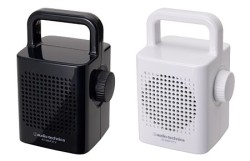 直径55mmのスピーカーを1基搭載したモノラルスピーカー。直径3.5mmの3極ミニプラグでテレビと接続し、離れたところで音声を聞くことができる。電池やAC電源などは必要なく、機器と接続して電気供給を受けるパッシブ型。本体にハンドルがついており、持ち運びにも便利だ。