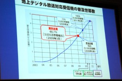 地デジ放送対応受信機の普及世帯数は6月末時点で5,384万台。世帯普及率は09年3月時点で60.7%だが、地域間で大きな差があり普及率が一番低い沖縄では37%にとどまっているという。地デジ完全移行には、この地域差にあわせてきめ細やかなPR活動を行っていくことが不可欠。