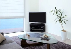 過度の部分をカットしたデザインを採用し、部屋のコーナーに置いた場合、42V型の薄型テレビを半畳分のスペースに設置することが可能。