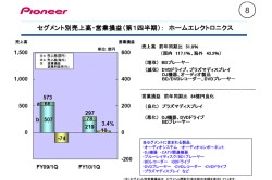 世界的な消費の冷え込みや円高の影響、また主にカーオーディオやDVDドライブ、プラズマディスプレイ、カーナビの売り上げが減少したことから売上高が減少。構造改革の効果や、プラズマディスプレイに関する特許料収入の一括計上などにより販売費や一般管理費が減少したが、売上高が減少したことなどにより、営業損失は88億円となった。