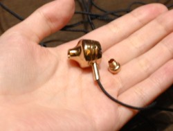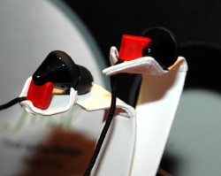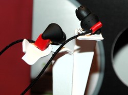 通常のイヤホンと同じくシリコンイヤーピースを装着して試聴するタイプだが、付属のイヤーピースには気孔を設けるなどシリコン素材の振動を極力抑制するよう工夫されている。