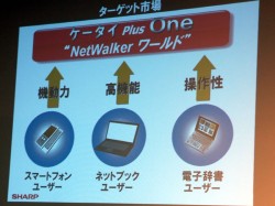 同社では本機を「ケータイ Plus One」のキャッチコピーの下に“NetWalker”という新たな名前を付与。松本氏は「本機はモバイル機器に求められる全ての機能を搭載している。新世代のモバイル端末で新しい市場が創造できる」と語り、創業100周年を迎える2012年に向けて「世界No.1の液晶ディスプレイでセインのユビキタス社会を実現する」と宣言した。