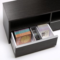 引き出しは小物をたっぷり収納してもスムーズに開閉できるスライドレール式で、メディア類を収納する場合は、タイトルが見える状態で収納可能。収納するメディア類のケースサイズや小物の大きさに合わせて調節できる仕切り板も付属する。
