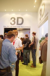 IFA2009のブースでは、DLA-HD950を2台スタック投写した3Dデモンストレーションを特別展示ブースで展開。隣接する3D液晶モニター「GD-463D10」(関連ニュース)の参考デモ展示ともに、来場者が長蛇の列をつくっている。