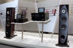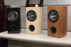 EXシリーズの思想と技術を継承しつつ欧州のデザインのトレンドを取り入れたスピーカーシステム“SERIES 8”。フランスのデザイナーと共同で作り上げたグロッシーブラックのキャビネットが印象的な本機だが、ブースにはホワイト/ブラウンモデルも展示されていた。このカラバリモデルは、欧州では昨年10月の発売と同時にラインナップされていたとのこと。