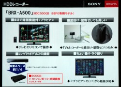 また、BPO専用のHDDレコーダー「BRX-A500」も用意。これまでも販売していた「BRX-A320」(関連ニュース)のHDDを500GBに増量したモデルで、W5と組み合わせた場合は、本体をテレビ背面に装着できる。さらに録画操作はBRAVIAのリモコンから直接行うことが可能で、録画予約もBRAVIAのEPGから行える。これにより「まるで録画機能一体型テレビのように使用することができる」(ソニーマーケティング担当者)としている。