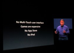 シラー氏は、米ビジネスウィーク誌で「iPhone/iPod touchはハンドヘルドゲームの中でもリーダーになっている」と紹介されたことに言及。巨大スクリーンにPSPとニンテンドーDSの写真を映し出し、「PSPとニンテンドーDSは、出始めたときは確かに革新的だったが、マルチタッチユーザーインターフェースもなく、ゲームソフトが高価なので子供には手が出しづらい。またApp Storeもなく、もちろんiPod機能も備えていない」と、PSPとニンテンドーDSに対するiPodの優位性を印象づけた。