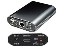 本機はUSB、またはLANで接続したPCからの映像・音声信号を、内部でHDMI出力が可能な信号に変換してAV機器につなぐことを可能にするという製品。解像度は最大1680×1050画素まで対応。OSはWindows Vista/XP/2000、USB2.0に対応する。またLANネットワークに接続中も、USBハブでキーボードやマウスをつないで接続されているPCのファイルを操作することも可能だ。USBハブ用端子は2系統を搭載する。