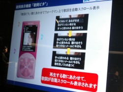 楽曲再生時に、再生する歌に合わせて歌詞を自動スクロール表示する新機能「歌詞ピタ」に対応。液晶画面に1行全角13文字で3行の歌詞が表示され、再生している楽曲に合わせて1行ずつ歌詞がスクロールしていく。