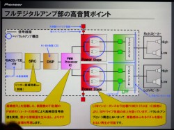 またDLNA経由での音楽再生、iPodのデジタル入力、Bluetoothへの対応など多彩な音楽ソースと再生スタイルに対応。iPodの音声ファイルはiPod内でD/D変換され、アンプにはリニアPCMで伝送されるしくみ。フルデジタル処理のため、伝送や変換によるロスが少ないのだそうです。こちらも圧縮音源を補間する「アドバンスド・サウンドレトリバー」によって高音質な再生を可能にしています。