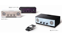 「TSX-W80」はiPod/iPhoneに付属のトランスミッターを装着してワイヤレスでiPod内のコンテンツを再生できる。iPod/iPhoneをリモコン代わりに電源オンオフ、ボリューム調節などを手元でコントロールすることが可能だ。カラーはライトブルー/アイボリー/ダークパープルの3色。