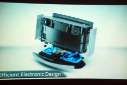 本体底面には独自のDSPを配置。不要な音の歪みを排除し、小音量再生時にもクリアな再現性を獲得させている。またアンプと電源にスイッチング回路を採用し、省電力と高効率化を合わせて実現。AC電源を用いず、本体をコンセントに接続するだけのシンプルな設計としている。