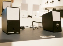 最大総合出力10Wの、デスクトップサイズを実現したアクティブスピーカー。ダブルバスレフ型式の採用により、コンパクトな筐体ながらリビングでのBGM再生にも対応する迫力ある音楽再生を実現している。筐体は内部で2つのチャンバーに分けられており、正面と背面に設けられたバスレフポートから空気が出ていくしくみ。開発担当者によると「ダブルバスレフは調整が難しいためあまり挑戦するメーカーがなかったが、オーディオテクニカの技術で挑戦した。音量を下げても低音が痩せず、しっかりと再生できる」という。