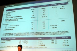 同社では、減収要因を世界的な景気低迷や円高などの影響によるものと説明。営業損益については、売上の減少にともない、売上原価および販売費・一般管理費の削減に努めたものの、円高による影響約770億円、構造改革費用の増加319億円、およびソニー・エリクソン・モバイルコミュニケーションズを主とする持分法適用会社の業績悪化の影響135億円などにより、営業損益が悪化したと説明した。
