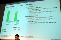 ゲームおよびPC・その他ネットワークビジネスなどの各事業が含まれるネットワークプロダクツ&サービス(NPS)分野の売上高は、前年同期比24.2%減少の3,526億円で、前年同期比182億円悪化となる588億円の営業損失を計上。この点について同社では、単価下落、売上台数の減少、および円高の影響によるPC“VAIO”の減収、そしてゲーム事業の減収によるものだと説明した。