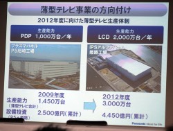 具体的には2012年度に、尼崎第5工場の起ち上げによってPDP生産を年1,000万台に増強。また液晶パネルの生産についても、姫路のIPSα液晶パネル工場を稼働させることで、2012年までに生産を2,000万台規模に高める。薄型テレビ用パネル合計で3,000万台の生産能力に引き上げる計画だ。現在の生産規模を大きく上回ることになるが、プラズマについては「3D対応をどこよりも速く市場投入する」ほか、液晶についても「小型市場を中心に台数ベースで2ケタ成長が見込まれる」と述べ、パネルの需給バランスについて楽観的な見通しを示した。LEDバックライトを搭載した液晶テレビについても「来年から発売する」とし、「生産能力、商品力を高めることで、熾烈なグローバル競争を勝ち抜いていく」と力強く宣言した。