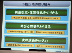 大坪氏は今後の取り組みについても説明を行った。ポイントは「構造改革・体質強化をやりきる」「伸びる市場を捉える」「次の成長を仕込む」の3点だとし、来年度からの新中期経営計画を見据えて薄型テレビ事業の方向付けを行っていると述べた。