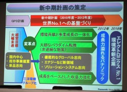 A:GP3では売上げ10兆円を目指していたが、今年度は7兆円にはとどまる。率直に言って、数値的には大きな乖離があると認識している。ただしCO2の圧縮については、昨年度、すでに目標数値を削減した。ここに一つの成果を感じている。ライバル各社とのポジショニングについては、韓国メーカー、特にサムスンに大きな成長力の差を付けられた。円とウォンの動きがまったく違うという大きなハンデがあったが、世界市場での勢いや評価を見ても、ポジショニングが大きく上がったとは考えていない。その一方、昨年10月に社名とブランドをパナソニックに統一した。インターブランド社のデータや国内のブランドランキングなどを見ると、ほとんどのランキングでポジションが上がっている。