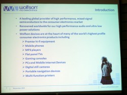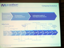 Wolfson Microelectronicsは1984年に設立され、オーディオ関連の半導体や低消費電力の半導体などを開発し、着実な成長を遂げてきた。2003年に上場し、現在ではオーディオ分野だけでなく調停消費電力ソリューションや高性能のミックスドシグナル半導体分野で世界をリードしている。2008年にはチップ総出荷台数が10億を超えた。