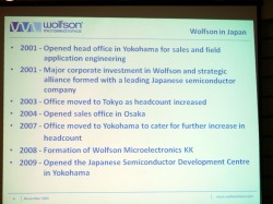 日本事業所を開設したのは2001年で、同時に日本の主要半導体企業との戦略的なアライアンスを締結。同時期に日本事業に対して巨額の投資を行ったという。その後、順調に事業を拡大し、2008年には日本法人であるウォルフソン・マイクロエレクトロニクス株式会社を設立した。