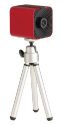 本製品は、ビデオカメラやiPodと接続して最大50V型までの画面サイズで投影できるプロジェクター。5cm四方という本体サイズと、約120gという軽量さが大きな特徴。ホワイトとレッドの2色を用意しており、型番の末尾にホワイトは「WH」、レッドは「RD」という文字が加えられる。
