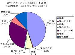 またAVエクスプレスは、1,500タイトル達成時のソフトジャンル別内訳も発表。これによるとシェアは洋画(44.4%)とアニメ(30.5%)がとりわけ高く、そのほか趣味教養(11.8%)、邦画(6.1%)、音楽(5.3%)のように続いている。