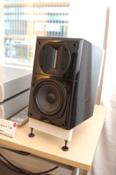 サエクコマースは富士ソフトアキバプラザの5階にブースを構え、今年から取り扱いを開始した「mhi」ブランドのスピーカー“Evidence”「MM01A」の試聴デモを行っている。