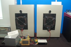 進エネルギ研究所はムービングマグネットスピーカーを展示。こちらは一般的なものとは逆に振動板に固定された磁石を1ビット駆動で動かすというもの。使用する磁石が少なくて済むほか、磁気回路が小さくスピーカーの薄型化が可能。インピーダンスを1/4/16Ωと切り替えられるのも特徴となっている。なお特許も出願済とのことだ。