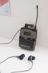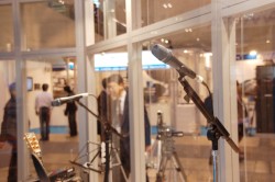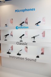 ゼンハイザーのマイク製品の展示も力のこもった内容だ。同社ブースのエントランスでは、プロミュージシャンによる特設デモが定期的に行われている。アーティストのパフォーマンスに関する詳細は本稿の中で後述するが、こちらの展示内容のメインコンセプトは、ミュージシャンの生演奏を素材とした、ゼンハイザーのマイクとモニターヘッドホンのデモンストレーションだ。遮音されたブースの中でミュージシャンが行った演奏を、ブースの外でモニターヘッドホン“HD-25”シリーズでモニタリングできる。ミュージシャンがブースの中で使うマイクは“evolution”シリーズのボーカル用コンデンサーマイク「e965」。またミュージシャンが演奏中、モニタリング用に使用しているのは“evolution wireless G2”シリーズのワイヤレスシステムと、イヤーモニターシリーズの「IE8」によるカップリングだ。