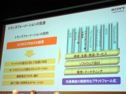 こうした変革について同社では、マーケットの変化に対して迅速に対応したり、顧客視点でのモノ創りなどを行うためのビジネスプロセスの改革が目的であると説明。「生産・物流・調達・サービス」「研究開発・共通ソフトウェア」「販売・マーケティング」という3点について共通機能の横断的なプラットフォーム化が重要だと説明した。