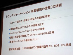 同社は、2012年度までに営業利益率5%、株主資本利益率(ROE)10%を達成することを目標とし、「トランスフォーメーション(変革)」を実施するという。