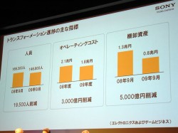 2009年度はソニーグループ全体で前年度比3,300億円の費用削減を計画しているが、今年度上半期で既に8割程度の削減を達成することができたとしている。さらに、年末から2010年にかけて強力な商品群を市場に投入していく体制も整ったと説明している。