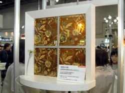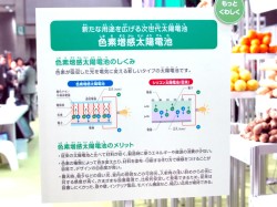 また、「色素増感太陽電池」と呼ばれる、色素を用いた太陽電池も参考出展。塗布・印刷が可能な色素を用いるため模様などをつけた太陽電池にすることができるという特徴があり、ブースには同技術を用いた窓ガラスなどを展示。模様のついた同電池を搭載したリチウムイオンバッテリーで“Walkman”を駆動させることも行っている。