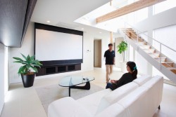 静岡の老舗ホームシアターショップ、AV BOXが手がけたリビングシアターです。フロントスピーカーやプレーヤーなどの機器類はオリジナルの壁面収納のなかに隠し、プロジェクターも昇降機を使って天井裏に収納しています。また、美しさだけでなく、居心地のよさも特筆。カスタマイズリモコンが導入されており、複雑な操作をしなくても快適に大画面とサラウンドの臨場感が楽しめます。