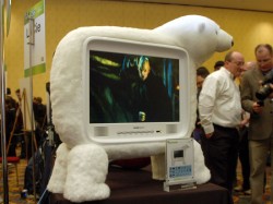 様々な製品が立ち並ぶ会場内でも、その外見で一際異彩を放っていたのが、HANNSPREE(ハンスプリー)社の「ST28FMUR」と「ST19PMUW」という液晶テレビ2機種だ。画面サイズはリンゴ型の「ST28FMUR」が28V型で、シロクマ型の「ST19PMUW」が19V型。ともにバージョン1.3のHDMI端子を2系統装備している。