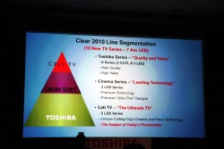 2010年度の東芝のディスプレイ・ラインナップについても説明が行われた。エントリークラスに位置づけられるのが、CCFLバックライトモデル3シリーズ、LEDバックライトモデル3シリーズの計6シリーズからなる“TOSHIBA series”だ。ミドルクラスに位置づけられる“Cinema series”は先進的な技術の搭載と超薄型化が特徴で、LEDモデルを2シリーズ用意。そして「究極のテレビ」と形容される最上位“CELL TV”がLEDモデルで2シリーズ展開される。