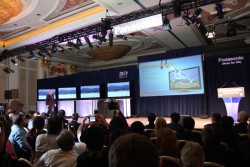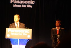 カンファレンス冒頭では、国際中継にて大阪からパナソニック(株)社長の大坪文雄氏が挨拶を行った。今回発表となった3Dビデオカメラを自ら手に持って紹介し、パナソニックが3Dにおけるエンド・ツー・エンドを担っていく上での意気込みを語った。