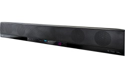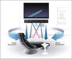 幅900mm×高さ125mm×奥行き85mmのワンボディの中に実用最大出力30Wのフルレンジスピーカーを4基内蔵。スピーカーユニットは8cmのフルレンジ防磁形・バスレフ方式。同社独自の4ch独立駆動フロントサラウンド技術により、フロント2chの音質を損なうことなく明瞭なセリフ再生、広範囲のサラウンド再生が行えるという。