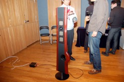 説明会には駆動方式の違うHVT方式スピーカーの試作機が登場し、試聴を行うことができた。