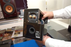 スタンダードモデルではエンクロージャー素材に無垢木材を採用していたが、本機ではMDFが用いられている。本機の発表に先駆けて、ビクターがマスコミ向けに開催した製品説明会には、同社のウッドコーンオーディオシステムの開発を指揮するホーム・エンタテインメント事業部 パーソナルAV統括部 技術部 開発グループ シニアエンジニアリングスペシャリストの今村智氏が登壇した。今回のエンクロージャー素材変更の理由について、今村氏は「無垢素材のまま黒鏡面仕上げを施そうとすると、木目が波打つような模様が浮き出てしまうためMDFを採用した」と説明する。MDF素材の上に何層にも重ね塗りされたうえ、2回の工程にわたるハンドバフ研磨を行い、本体背面を含むエンクロージャー全体に高級感のある黒鏡面塗装が施されている。