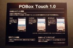 ソニー・エリクソン独自の予測変換・入力アシスト機能「POBox Touch 1.0」を搭載。「日本語入力のしやすさにこだわった」とのことで、母音キーを拡大表示する「ワイド」、次に使いそうなキーのみをハイライト表示する「ハイライト」、次候補キーをハイライト表示し、さらに拡大表示する「ダイナミック」の3つから設定することが可能だ。変換候補はタブ形式で表示され、選択しやすくなっている。また、「!」や「。」などよく使う記号を選択しやすいよう、キーボード下方にスペースが設けられている。