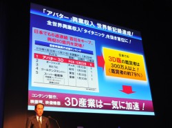 同氏はまた「フルHDの次のトレンドは映画館を見れば一目瞭然だ」とし、本題に移った。「共同プロモーションを行った『アバター』は、公開後39日間で、世界の歴代興行収入トップになった。アカデミー賞でも最多9部門にノミネートされており、町中でも「見た?」という会話が交わされているのを耳にする。まさに飛ぶ鳥を落とす勢いだ」とし、中でも「日本では、3D版の鑑賞者は全体の79%で、300万人以上に及ぶ。3D化が一気に加速している」と、3Dに対する一般の認知、理解が急速に進んでいることを説明した。