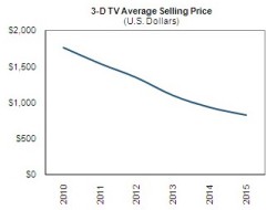 さらに同社は、3D市場でのメーカー間の競争が激しくなることで、3Dテレビの平均単価も大きく下がると予測。2010年には1,768ドル程度の単価が、2015年には825ドルまで落ちるとし、これが世界中の消費者を3Dテレビに引きつける、と述べている。