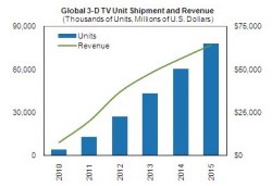 米調査会社のiSuppliは、グローバルの3Dテレビの出荷台数予測を発表した。それによると、2010年には420万台程度の市場が、2015年には7,800万台に大きく伸長するとしている。