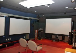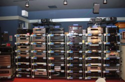 AVアンプ比較試聴スペースがあるのは「メカリア」という名前の視聴室。ここには国内の全メーカーの製品が展示されており、もちろんすべて視聴することができる。現時点でデノン/Integra/オンキヨー/ソニー/パイオニア/ヤマハ/マランツ/パナソニックの全39機種がスタンバイしており、新製品が発売されるごとに入れ替えを行い、HDMI端子搭載の現行ラインナップすべてをここで視聴できるようにする。ラックには最大42台まで格納できるようになっているという(製品ラインナップ一覧)。