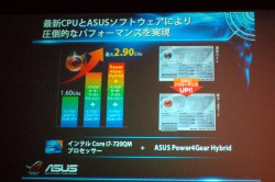 CPUのクロックは1.6GHzだが、ASUS独自の「Power4Gear Hybrid」テクノロジーを組合せて最大2.9GHzまでブーストすることが可能だ。また、1,249MHzで動作するグラフィックボード「NVIDIA GeForce GTS 360M」を搭載。1GBのGDDR5ビデオメモリも搭載し、パワフルで滑らかな描画処理を実現した。さらにGPUにはNVIDIA PhysXを内蔵しており、ゲームプレイ時には、飛び散る破片など複雑な描写もリアルタイム演算して描写することができる。