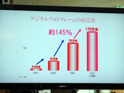 イベントの冒頭では、同社がデジタルフォトフレームや母の日を取り巻く状況を説明。母の日がある5月は、クリスマスに次いでギフト需要が高まり2,377億円もの経済効果があることや、デジタルフォトフレームの販売台数が年々増えて2010年には170万台に達する見込みであること、そして親へのプレゼントとして全体の約40パーセントがデジタルフォトフレームを検討しても良いと答えた独自調査結果などを紹介した。